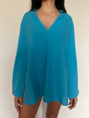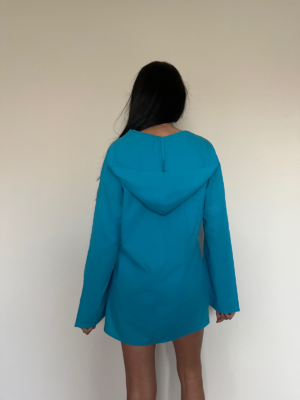 The Aries Dress features a loose flexible cut with a low v-neckline, a hood and flared sleeves. This ultra mini beach look is loose and easy to throw on any swim attire, with 2 dramatic slits on the sides to give your body some breathing-and-peaking room. Made to wear on bare feet or flip flops.