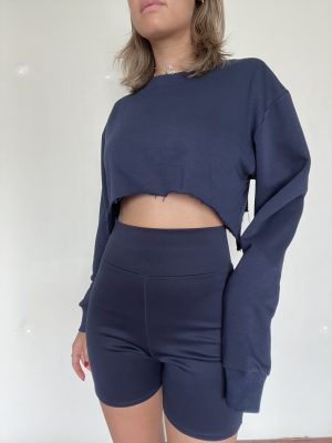 The Classic Cropped Sweater in navy is cut from 100% cotton french terry. Designed with a wide crew-neck frame and a loose cropped fit for girls to wear comfortably, pair them with one of the matching sweatpants or high-rise tailoring.
