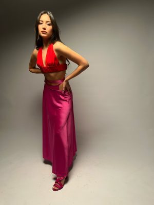 This transition statement piece can be dressed up or down easily. Cut from flowy silk, it has a monochrome waistband with adjustable wrap ties to be worn in many ways.