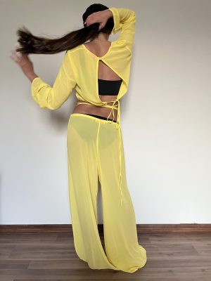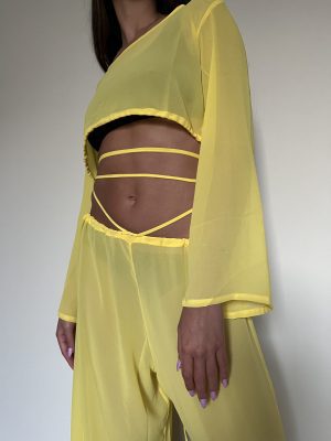 The Love Me beach set cut from chiffon is versatile, and flattering. A crop top that can be adjusted by a string to be worn tight or loose, with oversized flowy pants with an accompanying exaggerated drawstring to play around with. Available in many colors, pick your favorite and wear the two-piece set together or style each item with alternatives from your closet.
