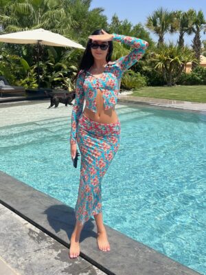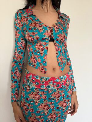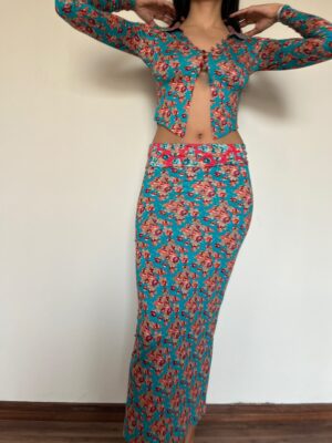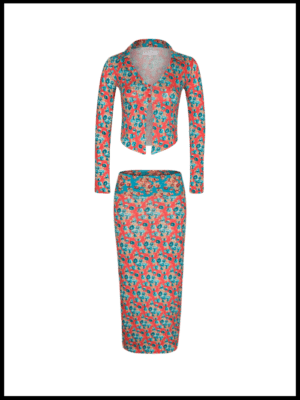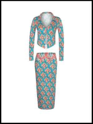 This set is where captivating style meets comfort. Crafted from stretch cotton, the two piece ensemble features a long sleeve top with 3 buttons and a body-hugging midi skirt. Adorned with a mesmerizing red floral print on a vibrant blue background, the Scorpius Set is fun, striking, and perfect for any occasion.