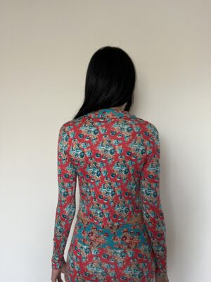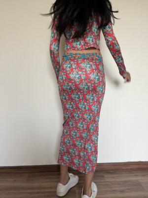 This set is where captivating style meets comfort. Crafted from stretch cotton, the two piece ensemble features a long sleeve top with 3 buttons and a body-hugging midi skirt. Adorned with a mesmerizing blue floral print on a vibrant red background, the Scorpius Set is fun, striking, and perfect for any occasion.